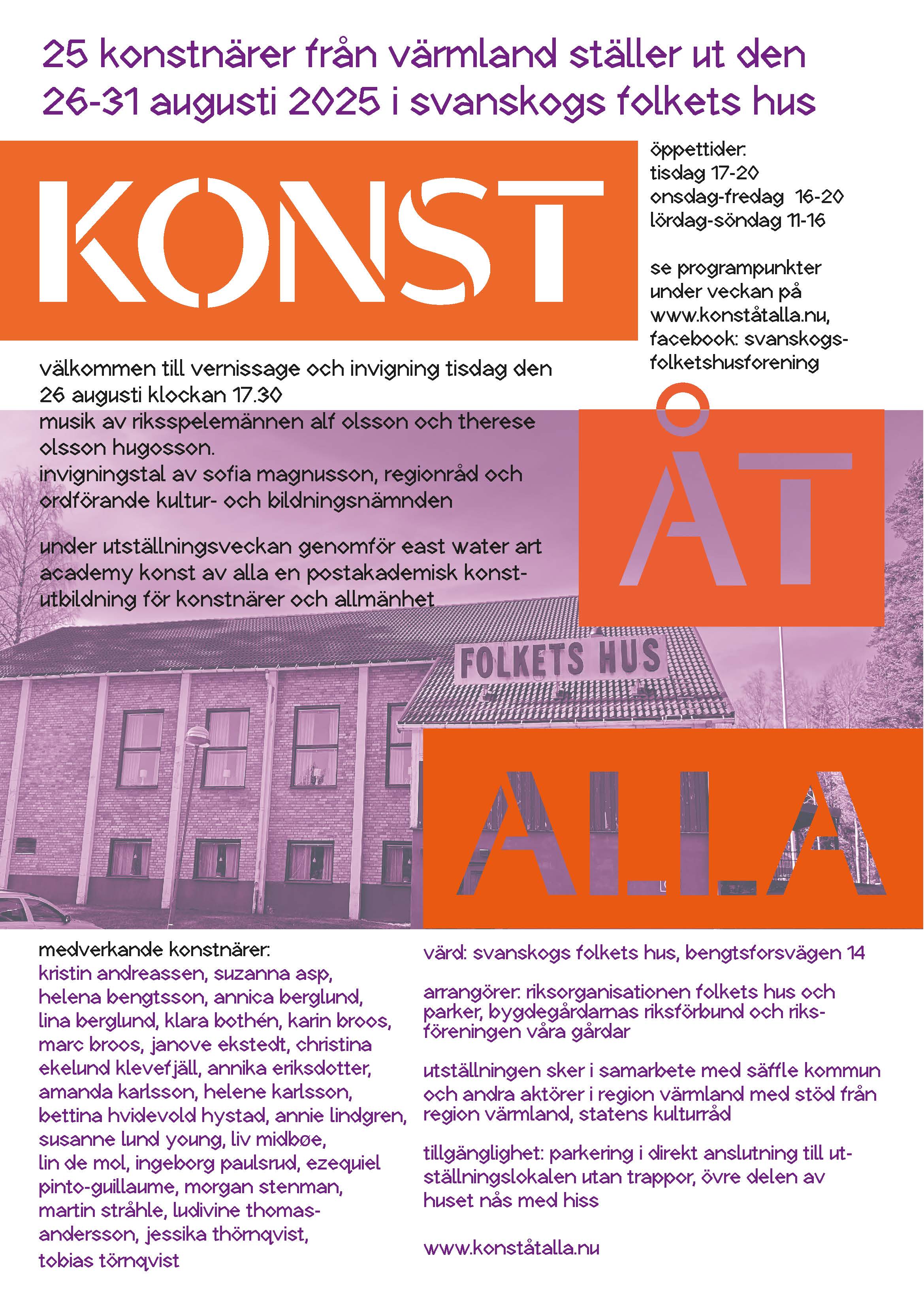 – Det känns som en stor ära för oss att Svanskogs Folkets Hus blivit utvald att vara värd för KONST ÅT ALLA och jätteroligt att intresset att delta varit så stort! Ser mycket framemot utställningen och mötet med alla dessa fina och spännande konstnärer – en stor och generös möjlighet för människor ute på landsbygden och i mindre orter att ta del av intressant och kvalitativ konst, säger Karin Olsson, sekreterare Svanskogs Folkets Hus Förening.