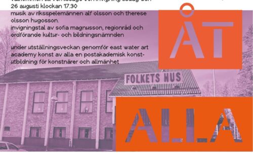 – Så roligt att genomföra en Konst åt alla-utställning i Svanskog Folkets Hus med konstnärer från hela Värmland. Intresset har varit stort och vår målsättning med KONST ÅT ALLA är att vi arrangerar utställningar i hela landet och att vi når Sveriges yrkesverksamma konstnärer. Alla ska känna sig delaktiga och välkomna i mötet med samtidskonsten – barn, unga och vuxna med olika bakgrunder och erfarenheter. Extra roligt är att Marc Broos genomför projektet ”Konst av alla, EastWaterArt Academys filial i Svanskog & dess postakademiska utbildning” för konstnärer och allmänhet under utställningsveckan. Det ligger helt i linje med konceptet KONST ÅT ALLA, säger Paula Hoffmann, konstansvarig Folkets Hus och Parker.